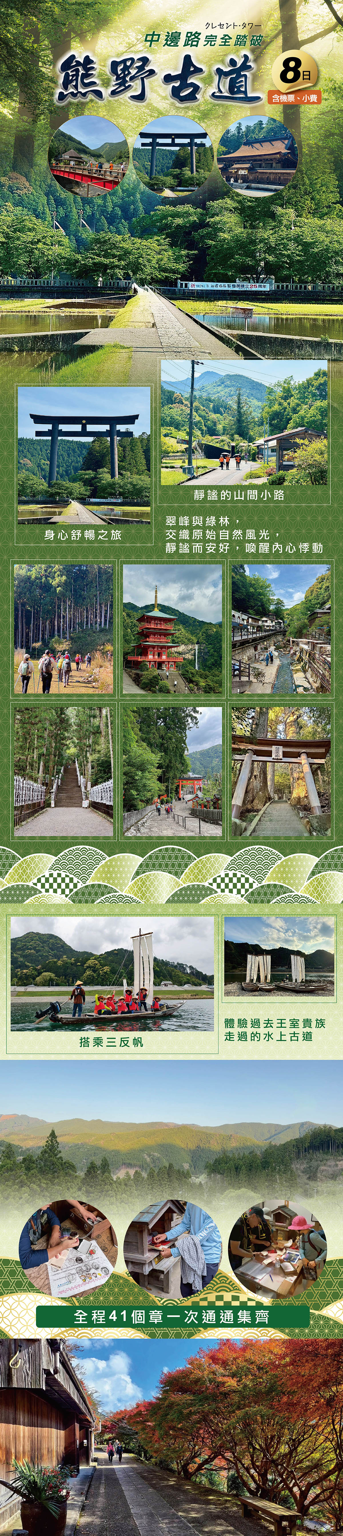 搭乘專屬遊覽車抵達滝尻王子後,正式展開今日的健行旅程。全程步行距離約12公里,預計耗時6至7小時。沿途穿梭於古老山徑與蒼翠林木之間,感受熊野古道深沉的自然與人文氛圍。根據隊伍的行進速度與團員當天的體力狀況,行程將視情況於牛馬童子或近露王子結束,保留彈性安排,讓每位旅客都能以舒適的節奏,自在走完這段熊野古道。
